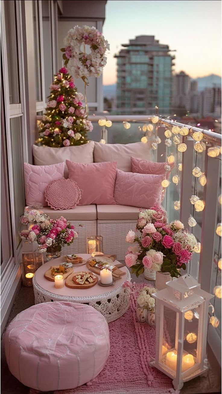Balconies can be styled with pink cushions and lights for cozy vibes.