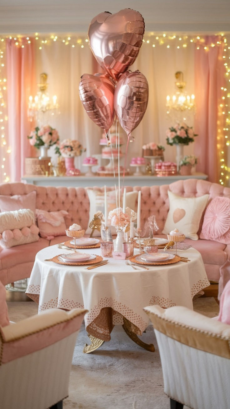Pink party décor sets the tone for celebrations. Balloons, tableware, and lighting work together.