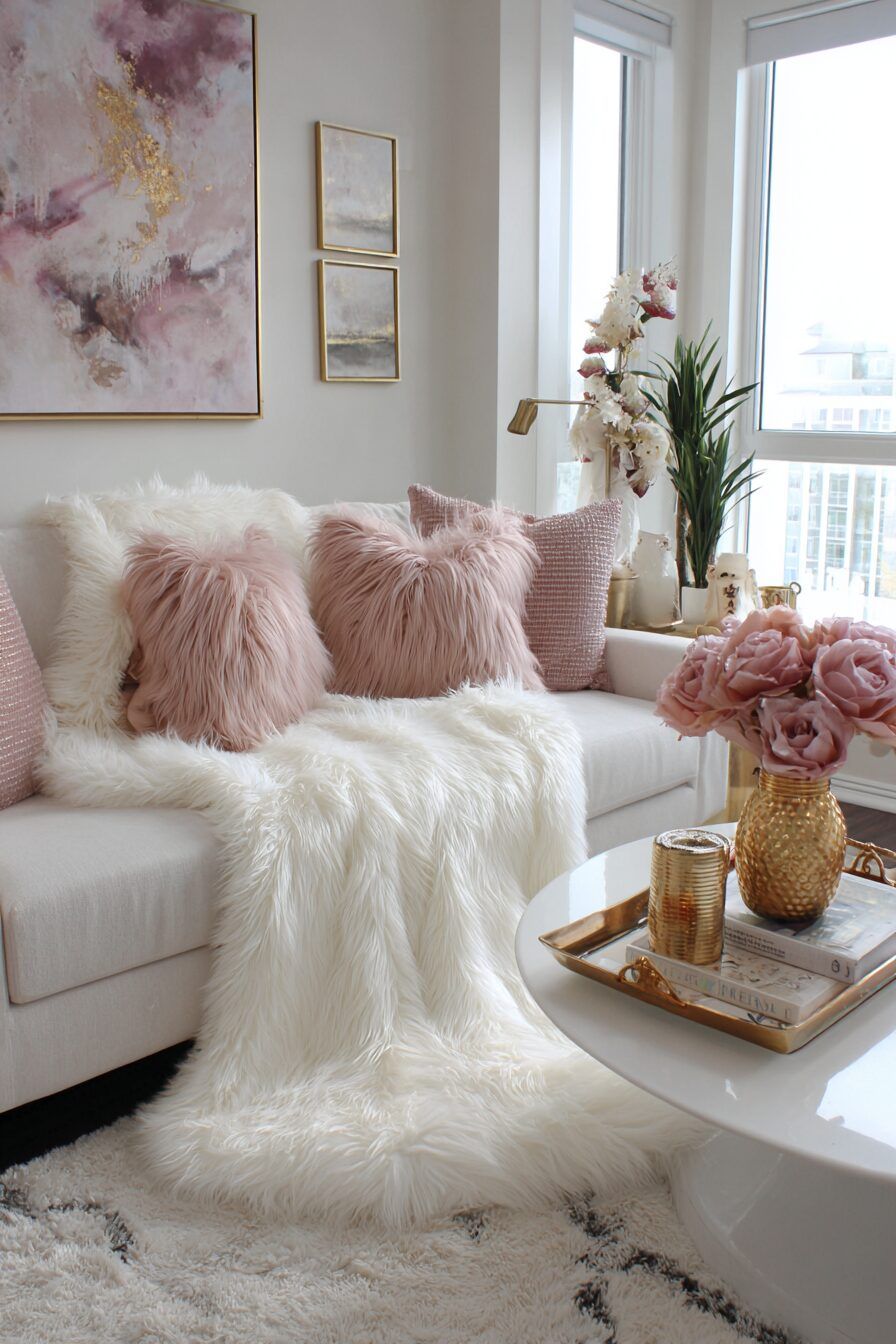 To make this idea Pinterest-worthy, focus on layering textures instead of adding too many decorations. Pair blush pink fabrics with cream sofas, light wood furniture, and gold accents for balance. If your living room feels small, stick to two or three pink elements to avoid visual overload. This method solves the common issue of Valentine’s décor looking overwhelming while still making the space feel warm, sweet, and festive.