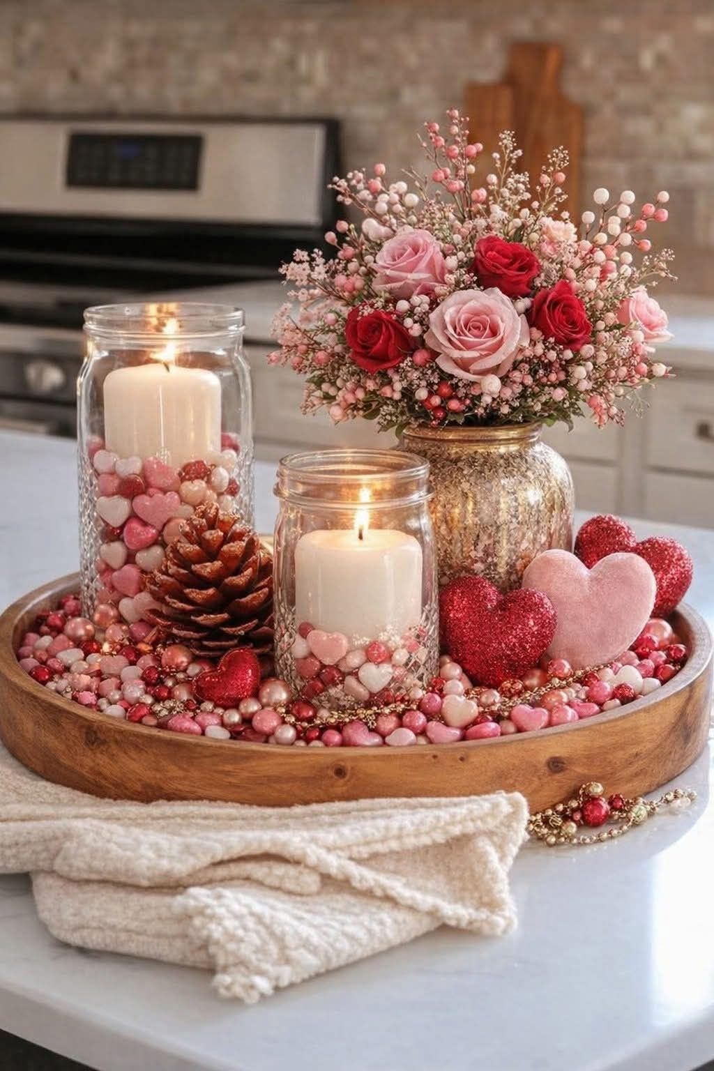 Pink candles instantly add warmth and romance to Valentine’s Day decor while keeping things simple and elegant. Whether you choose blush taper candles, pink pillar candles, or heart-shaped votives, candle décor works beautifully in living rooms, dining areas, and bedrooms. This idea is especially popular on Pinterest because it photographs well and feels luxurious without requiring major decorating changes.