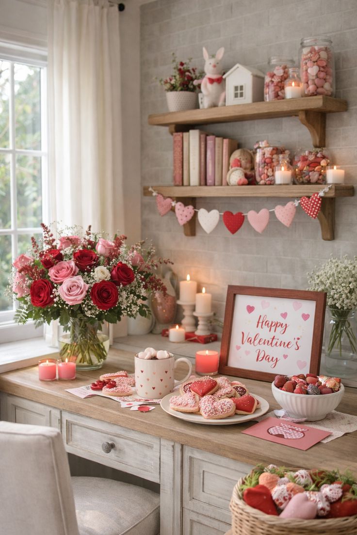 Pink shelf styling adds subtle Valentine’s charm without overwhelming your home. Small décor pieces, framed prints, and candles create layered visual interest. This idea works well for apartments and minimalist spaces.