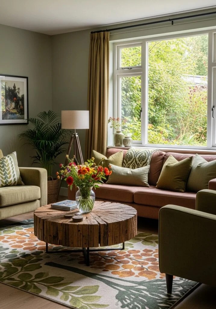 Connect your home to the outdoors by drawing color inspiration from nature, a master-level interior design strategy for creating a balanced and organic living room atmosphere. Because earthy greens, warm wood browns, sandy beiges, and sky blues naturally coexist in the environment, they possess an inherent visual harmony that feels instantly relaxing to the human eye. Incorporating these “biophilic” hues into your home styling creates a restorative sanctuary that promotes mental well-being and calmness, a core tenet of modern Jandapi and Organic Modern interiors. By layering these natural tones through high-quality materials—such as a jute rug, a forest green velvet sofa, or oak shelving—you mimic the effortless beauty of a landscape. To truly elevate this aesthetic, professional designers recommend “bringing the outside in” by adding vibrant indoor plants like a Fiddle Leaf Fig or an Olive Tree, which provide both literal life and a dynamic pop of texture. This approach ensures your color palette feels grounded and timeless, transforming a standard living area into a sophisticated, nature-inspired retreat that feels both expansive and intimately connected to the world outside.