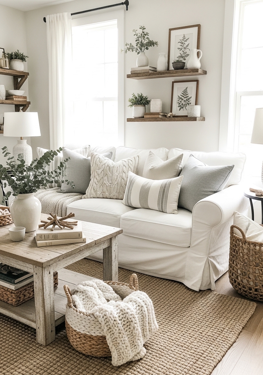 Indoor plants and organic greenery are the essential “final layer” that transforms a modern farmhouse into a living sanctuary. Incorporating potted olive trees, aromatic eucalyptus stems, and fresh kitchen herbs instantly softens neutral color palettes with a burst of natural vitality. These organic decor elements provide the necessary texture and movement to breathe life into minimalist spaces, making them feel vibrant and refreshed. By integrating farmhouse greenery, you create a seamless connection between the outdoors and your interior, ensuring your home feels grounded, airy, and authentically soul-soothing.